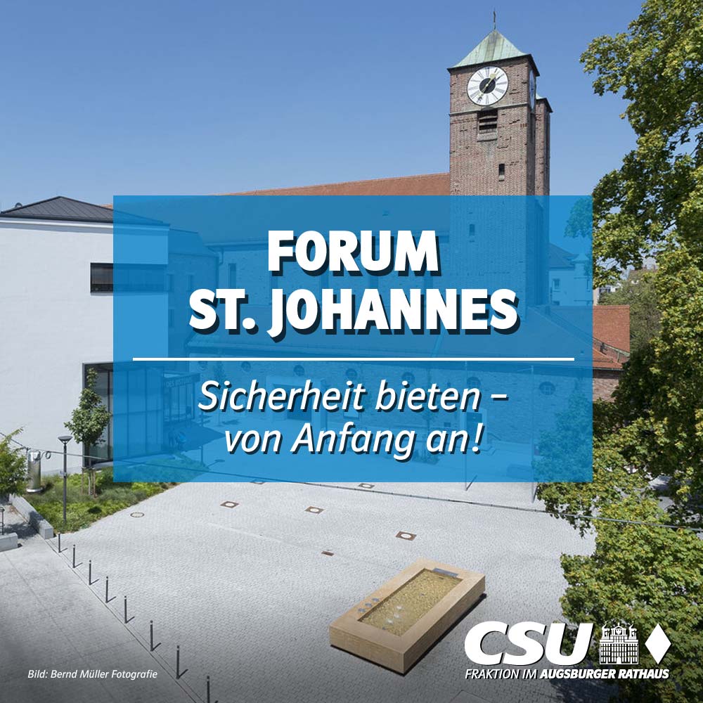 „Mit dem Forum St. Johannes entsteht eine Einrichtung, die von Beginn an die bestmöglichen Rahmenbedingungen braucht. Dazu gehört zwingend ein geordnetes und sicheres Umfeld“, erklärt die CSU-Stadtratsfraktion. „Nur so kann die Einrichtung ihre wichtige Rolle für Augsburg vom ersten Tag an voll entfalten.“
